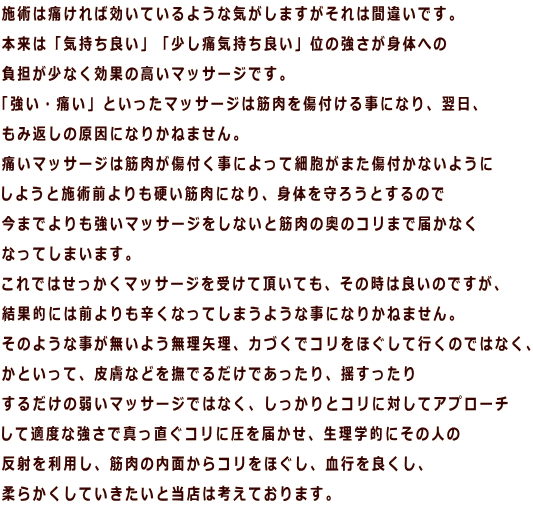 施術は痛ければ効いているような気がしますがそれは間違いです。 本来は「気持ち良い」「少し痛気持ち良い」位の強さが身体への 負担が少なく効果の高いマッサージです。 「強い・痛い」といったマッサージは筋肉を傷付ける事になり、翌日、 もみ返しの原因になりかねません。 痛いマッサージは筋肉が傷付く事によって細胞がまた傷付かないように しようと施術前よりも硬い筋肉になり、身体を守ろうとするので 今までよりも強いマッサージをしないと筋肉の奥のコリまで届かなく なってしまいます。 これではせっかくマッサージを受けて頂いても、その時は良いのですが、 結果的には前よりも辛くなってしまうような事になりかねません。 そのような事が無いよう無理矢理、力づくでコリをほぐして行くのではなく、 かといって、皮膚などを撫でるだけであったり、揺すったり するだけの弱いマッサージではなく、しっかりとコリに対してアプローチ して適度な強さで真っ直ぐコリに圧を届かせ、生理学的にその人の 反射を利用し、筋肉の内面からコリをほぐし、血行を良くし、 柔らかくしていきたいと当店は考えております。